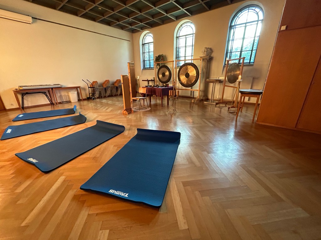 Die Klangreise ist rein rezeptiv. D.h. die Zuhörer liegen während der Klangmeditation auf Matten, lauschen den faszinierenden Klängen und lassen die Schwingungen auf sich wirken.